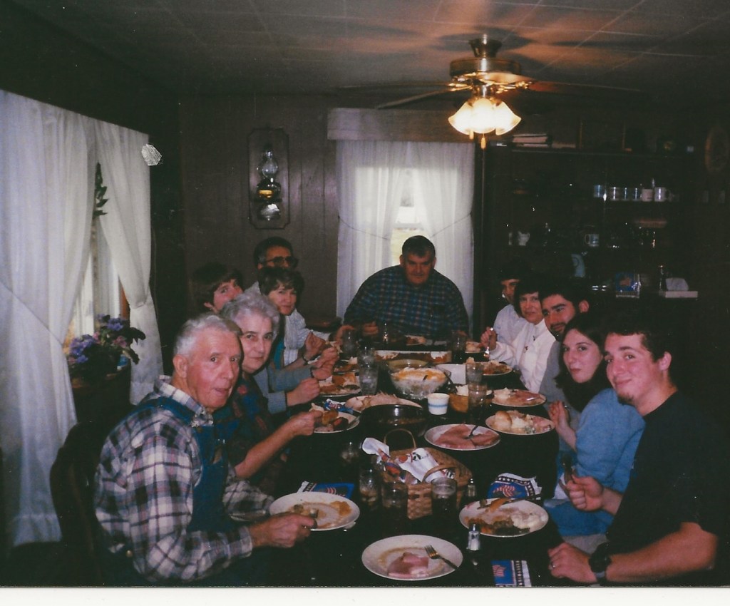 This picture was taken some time in the late 1900s or early 2000s. Four of the family members in the picture are now gone. My parents, far left, my husband, center in front of window, and a nephew, far right.